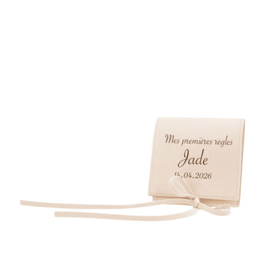 Ce petit écrin doux est gravé avec le prénom de la jeune fille et la date de ses premières règles. J’aime imaginer qu’elle le gardera toute sa vie, en pensant chaque fois au moment où ce cadeau lui a été offert.